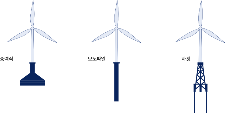 - 일반적으로 중력식 하부구조물, 모노파일 하부구조물, 자켓 하부구조물로 분류